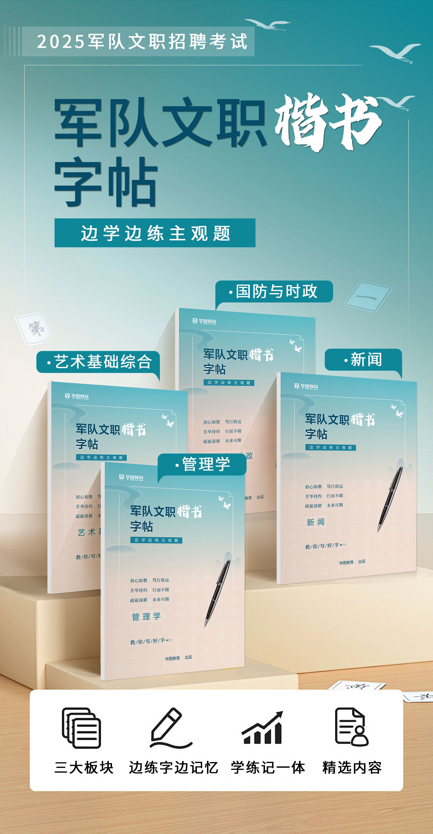 2026军队文职字帖国防与时政+管理学+新闻+艺术基础综合 4本由华图图书网为您提供,更多最新全国通用军队文职图书考试图书教材请关注华图图书网!